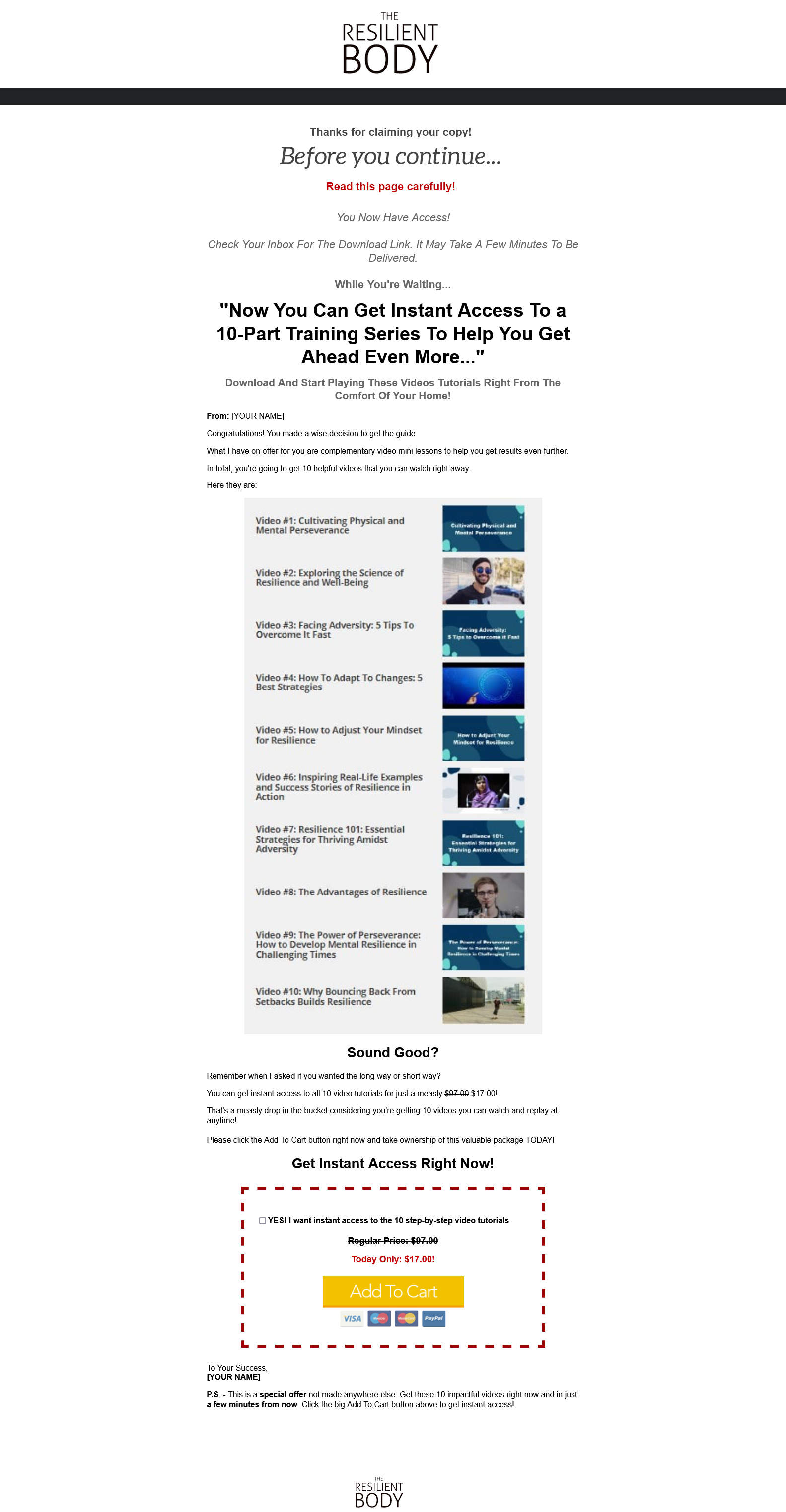 The Resilient Body Video Upgrade is a comprehensive course designed to help you build mental toughness, resilience, and unwavering confidence. This program equips you with the tools to face any challenge head-on, no matter how daunting the setbacks may be.