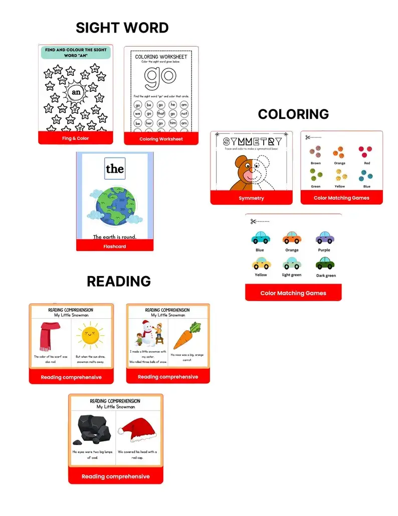 'Kindergarten Genius' offers a variety of educational materials, including: